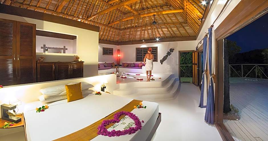 Featuring a large soaking tub built into the living room floor, wide extended decks, and 120 square yards of garden space, these large bungalows are located on a separate bay along the Eastern side of the resort. You can either enjoy the stunning views of the ocean or relax in a hammock. The romantic signature sunken tub is filled tub with floating petals and candles, and you can enjoy soft music, dim lighting and a bottle of wine chilling in an ice bucket.